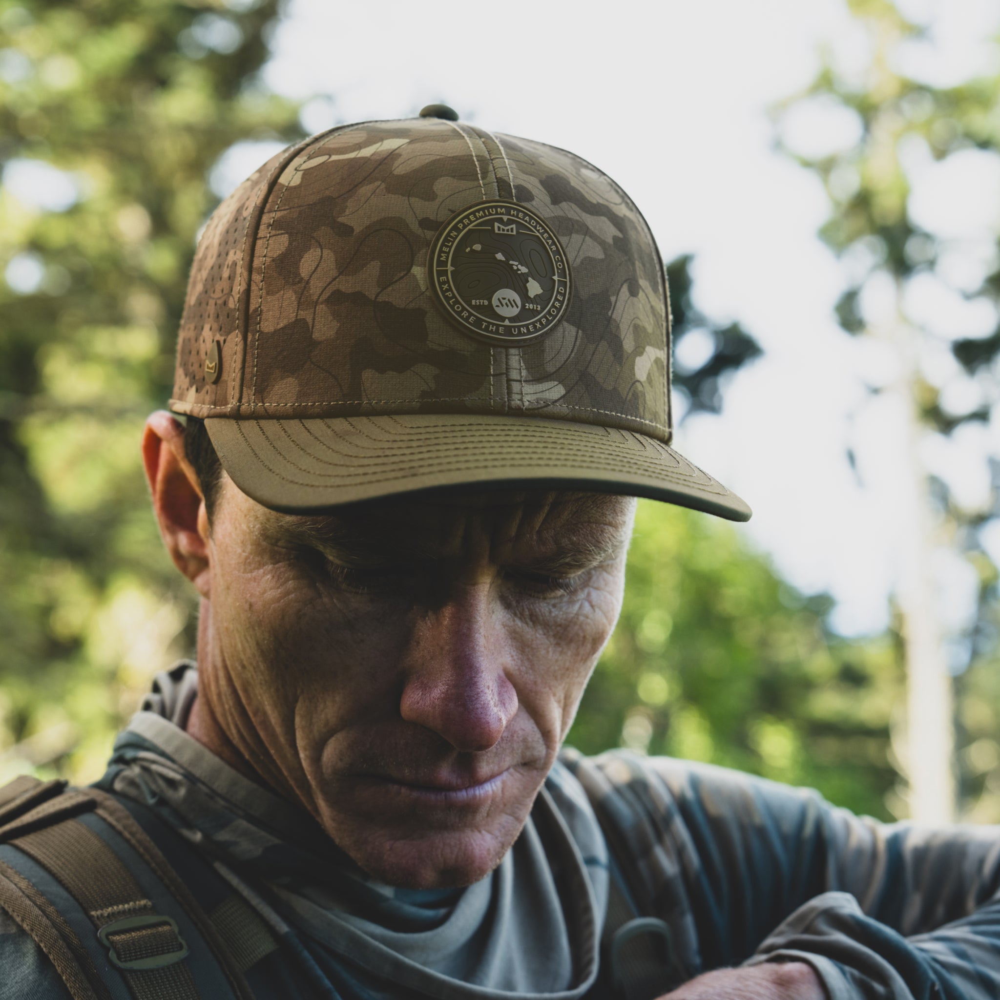 The Compass is a shape Mark Healey helped bring to life. Fit and utility matter most to him, especially during long days under the sun. His signature melin allows sunglasses to sit clean for full protection, providing a comfortable fit all day long. The camo design is an evolution of Healey’s first two signature hats, reflecting the side of his world outside of the water. Inspired by the green hills of Hawai’i and designed to look good in day-to-day life while easily following you into your pursuits out in nature.